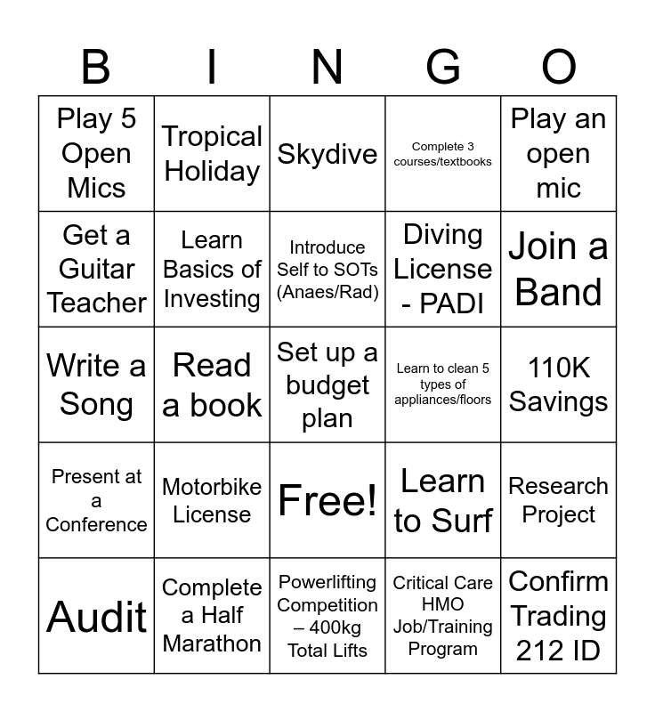 This bingo card has 26 words: Free!, Critical Care HMO Job/Training Program, Introduce Self to SOTs (Anaes/Rad), Complete a Half Marathon, Play an open mic, Play 5 Open Mics, Get a Guitar Teacher, Tropical Holiday, 110K Savings, Learn to Surf, Diving License - PADI, Write a Song, Research Project, Audit, Read a book, Muscle Up, Complete 3 courses/textbooks, Present at a Conference, Skydive, Set up a budget plan, Join a Band, Powerlifting Competition – 400kg Total Lifts, Learn to clean 5 types of appliances/floors, Motorbike License, Learn Basics of Investing and Confirm Trading 212 ID.