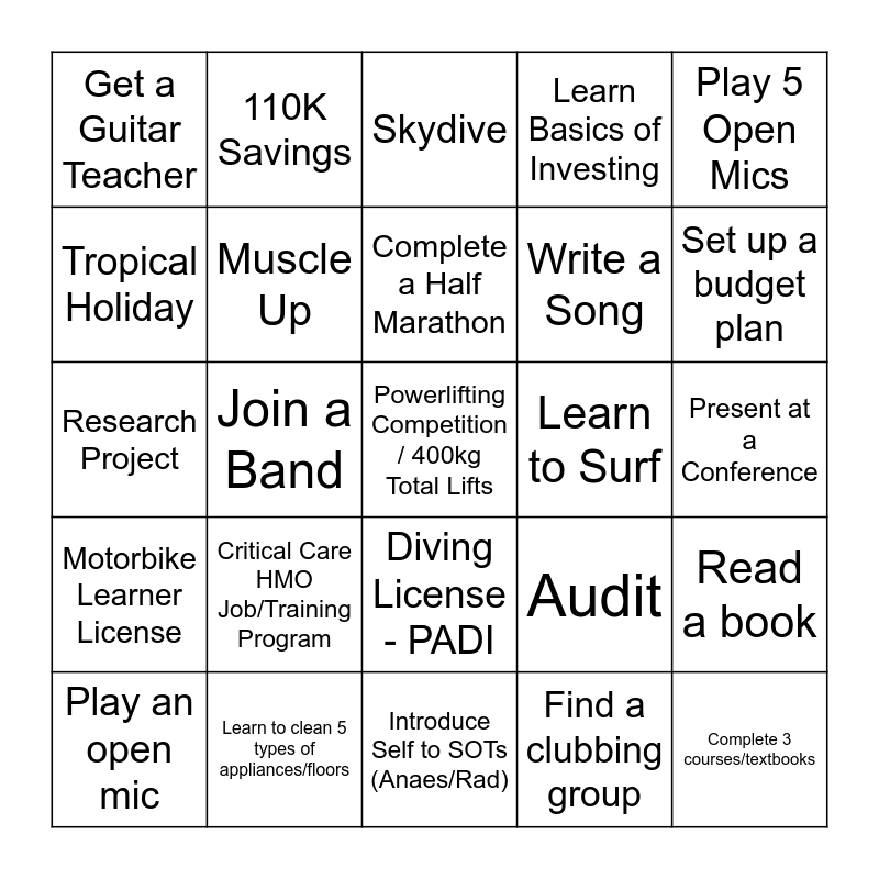 This bingo card has 25 words: Critical Care HMO Job/Training Program, Introduce Self to SOTs (Anaes/Rad), Complete a Half Marathon, Play an open mic, Play 5 Open Mics, Get a Guitar Teacher, Tropical Holiday, 110K Savings, Learn to Surf, Diving License - PADI, Write a Song, Research Project, Audit, Read a book, Muscle Up, Complete 3 courses/textbooks, Present at a Conference, Skydive, Set up a budget plan, Join a Band, Powerlifting Competition / 400kg Total Lifts, Learn to clean 5 types of appliances/floors, Motorbike Learner License, Learn Basics of Investing and Find a clubbing group.