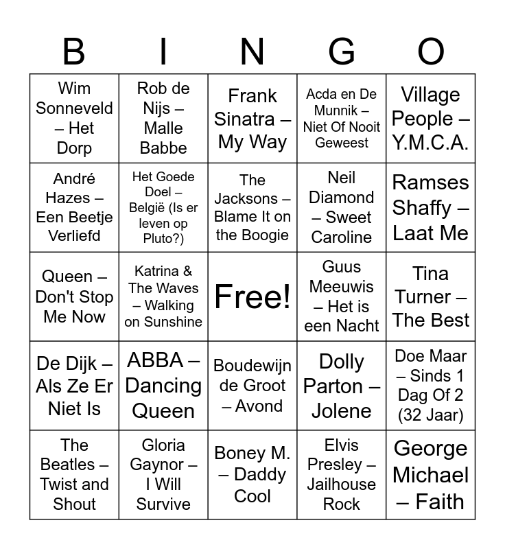 This bingo card has a free space and 25 words: ABBA – Dancing Queen, Boney M. – Daddy Cool, The Jacksons – Blame It on the Boogie, The Beatles – Twist and Shout, Village People – Y.M.C.A., Wim Sonneveld – Het Dorp, André Hazes – Een Beetje Verliefd, Rob de Nijs – Malle Babbe, Guus Meeuwis – Het is een Nacht, Boudewijn de Groot – Avond, Neil Diamond – Sweet Caroline, Queen – Don't Stop Me Now, Dolly Parton – Jolene, Doe Maar – Sinds 1 Dag Of 2 (32 Jaar), Het Goede Doel – België (Is er leven op Pluto?), Earth, Wind & Fire – September, Tina Turner – The Best, Frank Sinatra – My Way, Ramses Shaffy – Laat Me, Katrina & The Waves – Walking on Sunshine, George Michael – Faith, Gloria Gaynor – I Will Survive, De Dijk – Als Ze Er Niet Is, Acda en De Munnik – Niet Of Nooit Geweest and Elvis Presley – Jailhouse Rock.