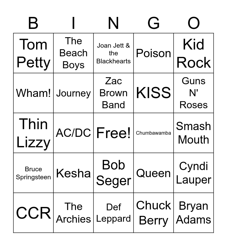 This bingo card has a free space and 37 words: Rick Astley, Village People, Train, Journey, Cyndi Lauper, Kesha, Zac Brown Band, Baha Men, Kid Rock, Lynyrd Skynyrd, AC/DC, Poison, Bryan Adams, Smash Mouth, Wham!, Bruce Springsteen, Neil Diamond, Joan Jett & the Blackhearts, Bob Seger, Chumbawamba, Tom Petty, Guns N' Roses, CCR, Def Leppard, Spin Doctors, Chuck Berry, The Beach Boys, Bee Gees, Van Morrison, Aerosmith, Elvis Presley, The Archies, Thin Lizzy, Billy Idol, Queen, KISS and Twisted Sister.