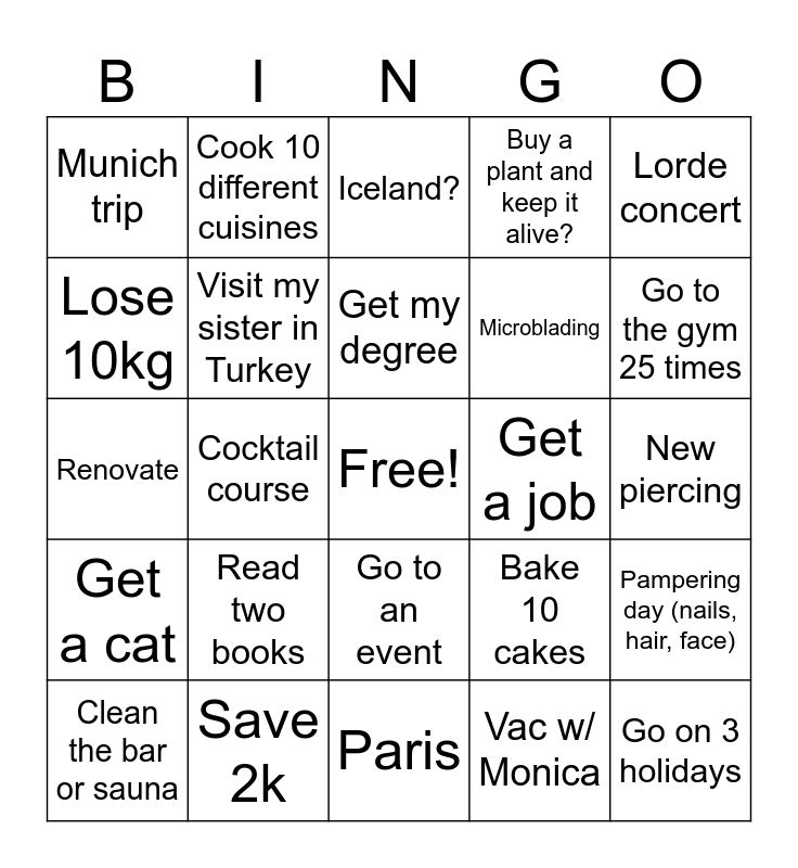 This bingo card has a free space and 24 words: Read two books, Save 2k, Get my degree, Clean the bar or sauna, Lorde concert, Munich trip, Lose 10kg, Cook 10 different cuisines, Get a job, Go to an event, Microblading, Renovate, Bake 10 cakes, Pampering day (nails, hair, face), Visit my sister in Turkey, Vac w/ Monica, New piercing, Iceland?, Go to the gym 25 times, Cocktail course, Go on 3 holidays, Get a cat, Buy a plant and keep it alive? and Paris.