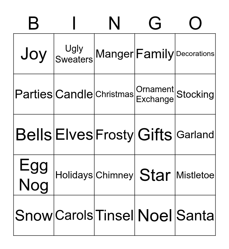 This bingo card has 40 words: Angel, Bells, Cake, Candle, Carols, Chimney, Christmas, Cookies, Decorations, Egg Nog, Elves, Family, Frosty, Garland, Gifts, Holidays, Holly, Joy, Lights, Manger, Mistletoe, Noel, Ornament Exchange, Parties, Peace, Presents, Reindeer, Rudolph, Santa, Shopping, Sleigh, Snow, Stable, Star, Stocking, Tinsel, Tree, Turtle Doves, Ugly Sweaters and Wreath.