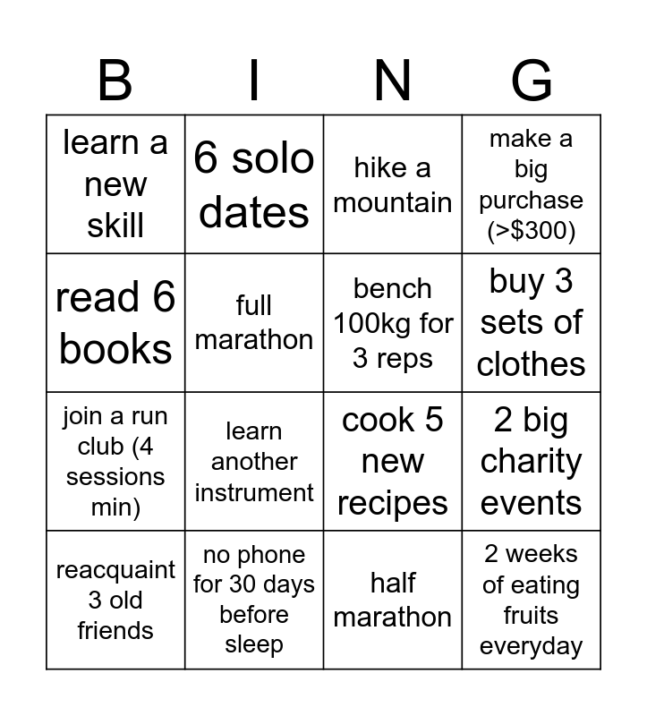 This bingo card has 16 words: no phone for 30 days before sleep, 2 big charity events, hike a mountain, learn a new skill, join a run club (4 sessions min), 6 solo dates, cook 5 new recipes, half marathon, read 6 books, full marathon, reacquaint 3 old friends, make a big purchase (>$300), learn another instrument, buy 3 sets of clothes, bench 100kg for 3 reps and 2 weeks of eating fruits everyday.