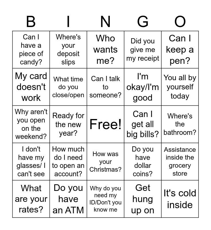 This bingo card has a free space and 24 words: What are your rates?, How much do I need to open an account?, Can I talk to someone?, Get hung up on, Can I keep a pen?, Can I have a piece of candy?, Where's your deposit slips, Who wants me?, Can I get all big bills?, Where's the bathroom?, Why aren't you open on the weekend?, What time do you close/open, Do you have dollar coins?, Assistance inside the grocery store, My card doesn't work, Do you have an ATM, Why do you need my ID/Don't you know me, Did you give me my receipt, You all by yourself today, I don't have my glasses/ I can't see, Ready for the new year?, How was your Christmas?, I'm okay/I'm good and It's cold inside.