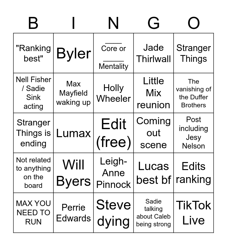 This bingo card has a free space and 24 words: Will Byers, Perrie Edwards, Holly Wheeler, MAX YOU NEED TO RUN, Stranger Things, "Ranking best", Nell Fisher / Sadie Sink acting, Byler, Coming out scene, Leigh-Anne Pinnock, Little Mix reunion, Stranger Things is ending, Lucas best bf, Edits ranking, Max Mayfield waking up, Sadie talking about Caleb being strong, Post including Jesy Nelson, ____ Core or _____ Mentality, The vanishing of the Duffer Brothers, Lumax, TikTok Live, Not related to anything on the board, Jade Thirlwall and Steve dying.