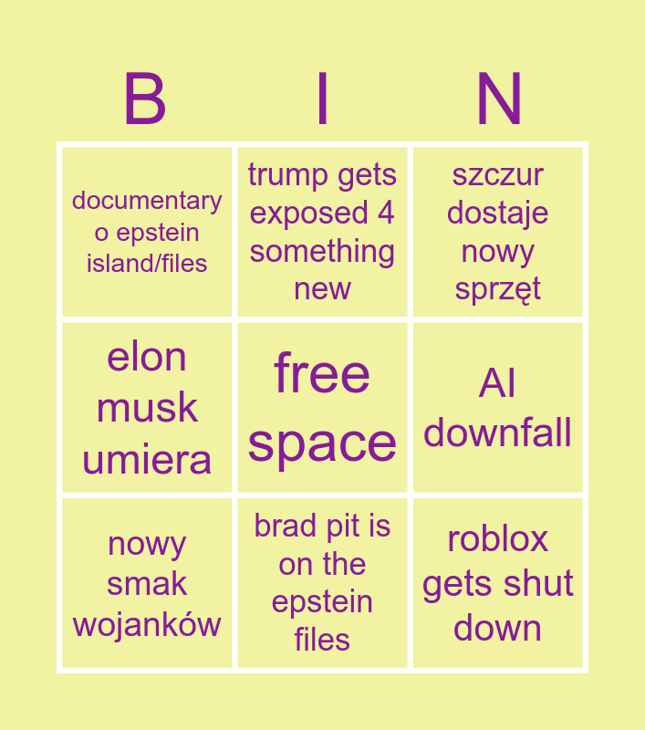 This bingo card has a free space and 8 words: AI downfall, szczur dostaje nowy sprzęt, trump gets exposed 4 something new, nowy smak wojanków, documentary o epstein island/files, roblox gets shut down, elon musk umiera and brad pit is on the epstein files.
