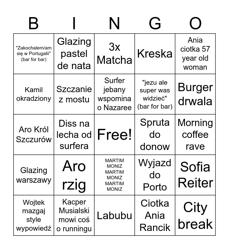This bingo card has a free space and 24 words: Aro rzig, Kacper Musialski mowi coś o runningu, Surfer jebany wspomina o Nazaree, Wojtek mazgaj style wypowiedź, Ania ciotka 57 year old woman, "Zakochalem/am się w Portugalii" (bar for bar), Kamil okradziony, Glazing pastel de nata, Spruta do donow, MARTIM MONIZ MARTIM MONIZ MARTIM MONIZ, "jezu ale super was widzieć" (bar for bar), Aro Król Szczurów, Wyjazd do Porto, Sofia Reiter, Szczanie z mostu, Ciotka Ania Rancik, Morning coffee rave, 3x Matcha, Burger drwala, Diss na lecha od surfera, City break, Glazing warszawy, Kreska and Labubu.