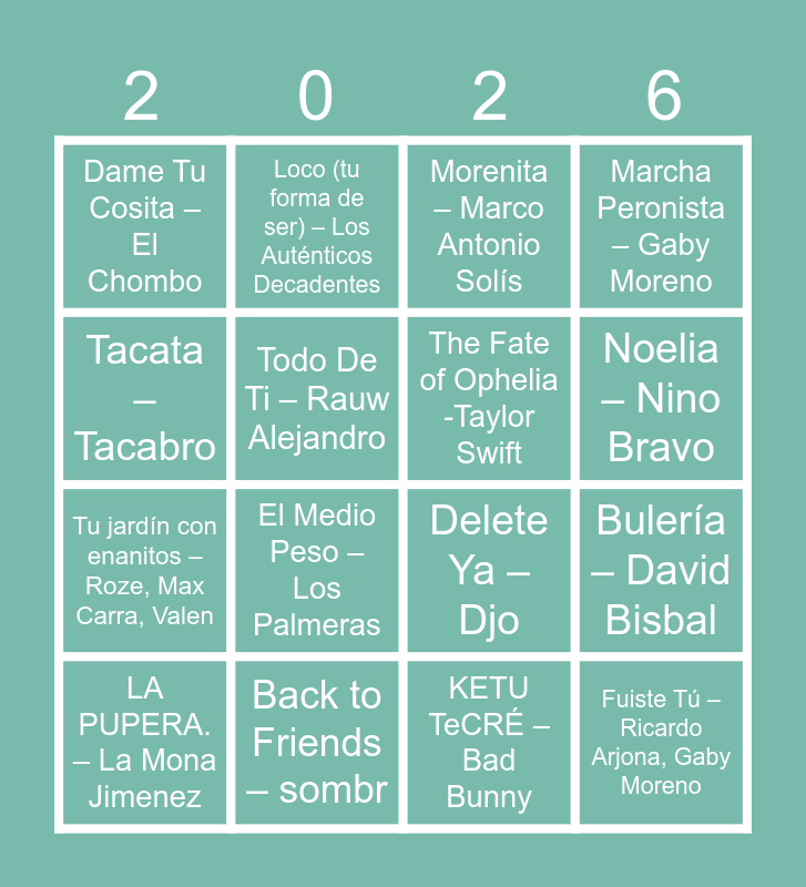This bingo card has 64 words: Alone – Bee Gees, The Final Countdown – Europe, No Voy en Tren – Charly García, El Hombre Del Piano – Guillermo Guido, Kilómetro 11 – Tránsito Cocomarola, Jurabas Tu – Los del Fuego, Loco (tu forma de ser) – Los Auténticos Decadentes, Solo Heridas – Mario Pereyra, Noelia – Nino Bravo, We Found Love – Rihanna, Calvin Harris, Olvidarte – Gordo, Emilia, capaz(merengueton) – Alleh, Yorghaki, KETU TeCRÉ – Bad Bunny, Tacata – Tacabro, Cachete, Pechito y Ombligo – Pancho Y La Sonora Colorada, Todo De Ti – Rauw Alejandro, Bulería – David Bisbal, Dame Tu Cosita – El Chombo, Zoo – Shakira, Tu jardín con enanitos – Roze, Max Carra, Valen, Me llama – Momo, Fuiste Tú – Ricardo Arjona, Gaby Moreno, Marcha Peronista – Gaby Moreno, Mata (Techengue) – js music, Jere Suez, Timber – Pitbull, Kesha, Wake Me Up – Avicii, BORRAXXA – Feid, Manuel Turizo, SIN SEÑAL – Quevedo, Ovy On The Drums, La player (Bandolera) – Zion & Lennox, Te Esperaba – Carlos Rivera, La Morocha – Luck Ra, BM, Colgando en tus manos – Carlos Baute, Marta Sánchez, Quiero Decirte – Abraham Mateo, Ana Mena, Roma – Luis Fonsi, Laura Pausini, El Medio Peso – Los Palmeras, Soy Sabalero – Los Palmeras, ¿Quién Se Tomó Todo El Vino? – La Mona Jimenez, Agujita De Oro – La Mona Jimenez, No Te Vayas Corazón – Los Wawanco, The Fate of Ophelia -Taylor Swift, Delete Ya – Djo, Back to Friends – sombr, We Didn´t Start the Fire – Billy Joel, Out of Touch – Daryl Hall & John Oates, Sultans Of Swing – Dire Straits, LA PUPERA. – La Mona Jimenez, Con Otra – Eugenia Quevedo, La banda de Carlitos, Que Onda Perdida – Q’ Lokura, Nadie Es Perfecto – Los Caligaris, Manchild – Sabrina Carpenter, Vámonos De Viaje – Bandalos Chinos, mi refe – Beéle, Ovy On The Drums, Los Calientes – Babasonicos, Bem, Bem, Maria – Gipsy Kings, Sweet Caroline – Neil Diamond, What Makes You Beautiful – One Direction, Morenita – Marco Antonio Solís, Tragedy – Bee Gees, Butterfly, Butterfly – a-ha, Livin’ On A Prayer – Bon Jovi, Fala Comigo – Gusttavo Lima, Corazón – Los Auténticos Decadentes, En Privado – Xavi, Manuel Turizo and El Merengue – Marshmello, Manuel Turizo.