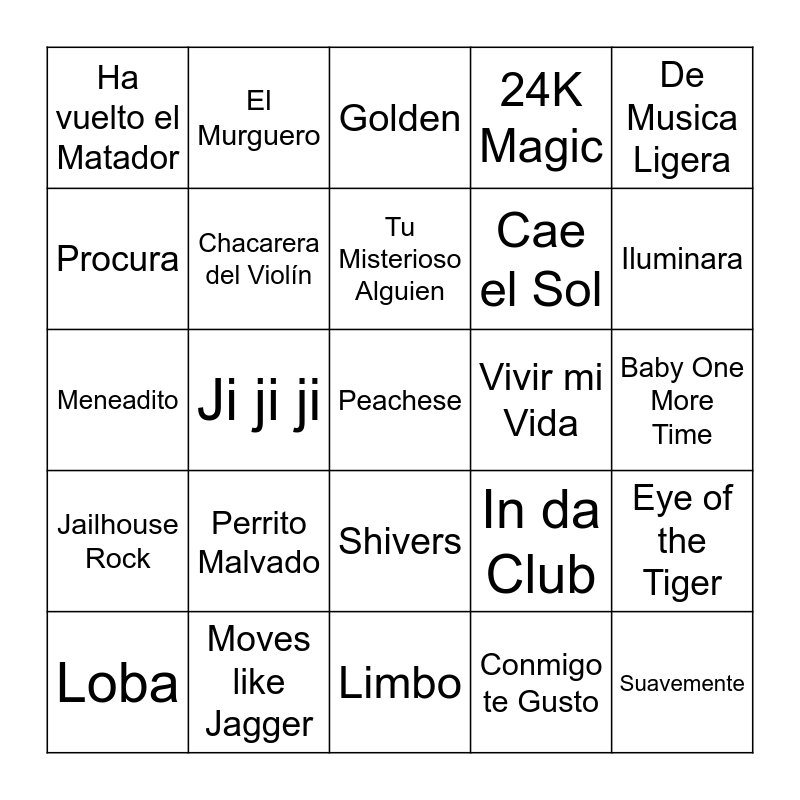 This bingo card has 25 words: Jailhouse Rock, Moves like Jagger, Peachese, Conmigo te Gusto, De Musica Ligera, Ha vuelto el Matador, El Murguero, Golden, Vivir mi Vida, Eye of the Tiger, Procura, Chacarera del Violín, Limbo, In da Club, Iluminara, Loba, Ji ji ji, Tu Misterioso Alguien, Cae el Sol, Baby One More Time, Meneadito, Perrito Malvado, Shivers, 24K Magic and Suavemente.