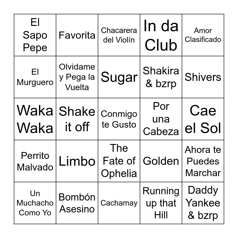 This bingo card has 25 words: Perrito Malvado, Bombón Asesino, Conmigo te Gusto, Running up that Hill, Amor Clasificado, El Sapo Pepe, Favorita, Chacarera del Violín, Por una Cabeza, Ahora te Puedes Marchar, El Murguero, Olvidame y Pega la Vuelta, Cachamay, Golden, Shivers, Un Muchacho Como Yo, Shake it off, Sugar, Shakira & bzrp, Cae el Sol, Waka Waka, Limbo, The Fate of Ophelia, In da Club and Daddy Yankee & bzrp.