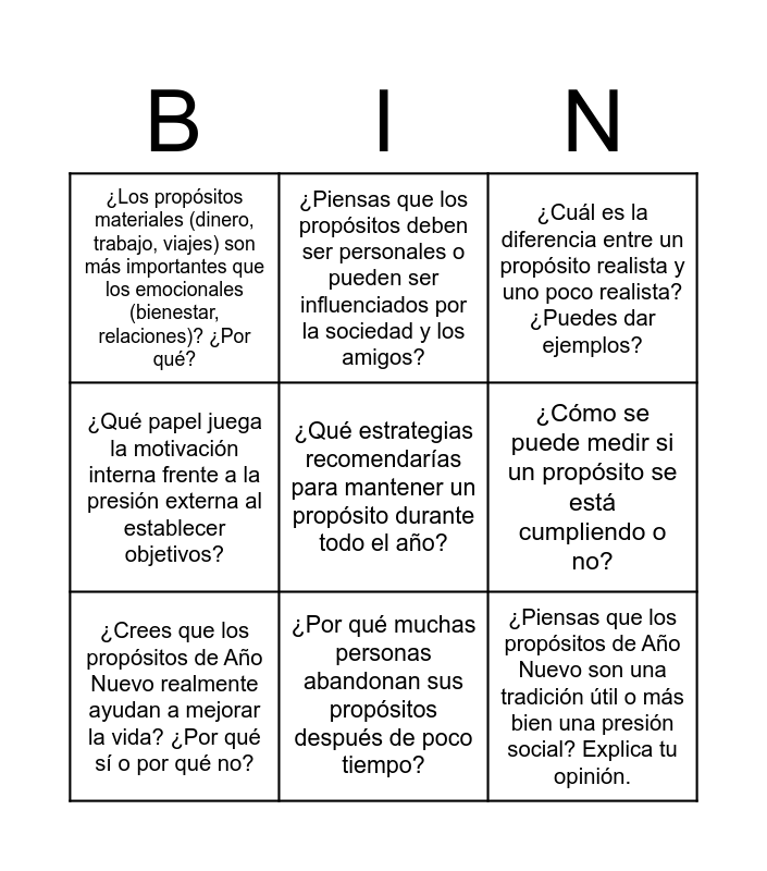 This bingo card has 9 words: ¿Crees que los propósitos de Año Nuevo realmente ayudan a mejorar la vida? ¿Por qué sí o por qué no?, ¿Cuál es la diferencia entre un propósito realista y uno poco realista? ¿Puedes dar ejemplos?, ¿Piensas que los propósitos deben ser personales o pueden ser influenciados por la sociedad y los amigos?, ¿Qué papel juega la motivación interna frente a la presión externa al establecer objetivos?, ¿Los propósitos materiales (dinero, trabajo, viajes) son más importantes que los emocionales (bienestar, relaciones)? ¿Por qué?, ¿Cómo se puede medir si un propósito se está cumpliendo o no?, ¿Qué estrategias recomendarías para mantener un propósito durante todo el año?, ¿Piensas que los propósitos de Año Nuevo son una tradición útil o más bien una presión social? Explica tu opinión. and ¿Por qué muchas personas abandonan sus propósitos después de poco tiempo?.