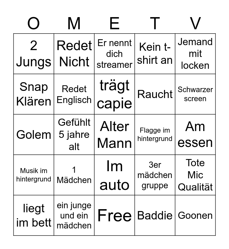 This bingo card has 25 words: Musik im hintergrund, ein junge und ein mädchen, Alter Mann, Baddie, Jemand mit locken, 2 Jungs, Redet Nicht, Er nennt dich streamer, Flagge im hintergrund, Tote Mic Qualität, Snap Klären, Redet Englisch, Free, 3er mädchen gruppe, Schwarzer screen, liegt im bett, Gefühlt 5 jahre alt, trägt capie, Raucht, Am essen, Golem, 1 Mädchen, Im auto, Kein t-shirt an and Goonen.