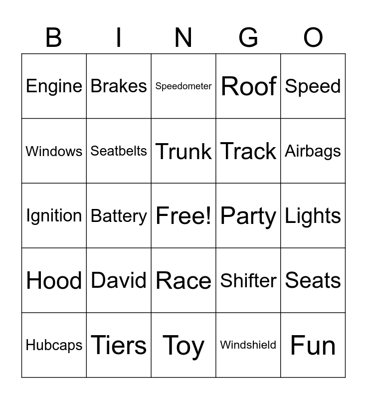 This bingo card has a free space and 24 words: David, Tiers, Trunk, Hubcaps, Speed, Engine, Windows, Brakes, Party, Race, Track, Ignition, Shifter, Seats, Seatbelts, Windshield, Lights, Speedometer, Airbags, Battery, Fun, Hood, Roof and Toy.