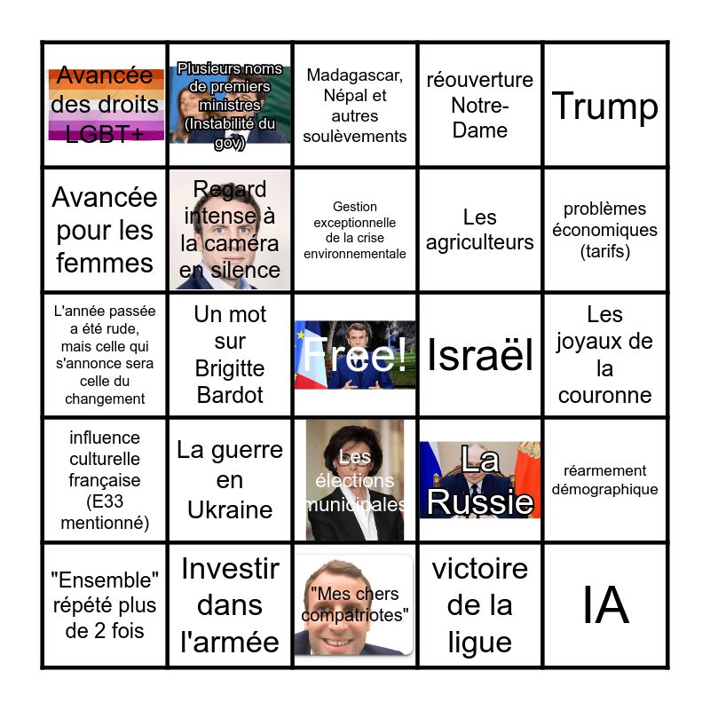This bingo card has 6 images, a free space and 24 words: La guerre en Ukraine, Investir dans l'armée, Gestion exceptionnelle de la crise environnementale, "Ensemble" répété plus de 2 fois, Trump, Avancée des droits LGBT+, Avancée pour les femmes, Plusieurs noms de premiers ministres (Instabilité du gov), Israël, Les élections municipales, Les agriculteurs, L'année passée a été rude, mais celle qui s'annonce sera celle du changement, La Russie, réarmement démographique, Regard intense à la caméra en silence, victoire de la ligue, Les joyaux de la couronne, Madagascar, Népal et autres soulèvements, problèmes économiques (tarifs), Un mot sur Brigitte Bardot, IA, influence culturelle française (E33 mentionné), réouverture Notre-Dame and "Mes chers compatriotes".