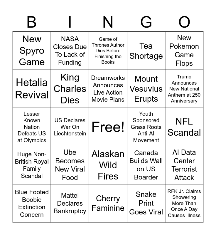 This bingo card has a free space and 24 words: Ube Becomes New Viral Food, Mattel Declares Bankruptcy, Dreamworks Announces Live Action Movie Plans, Blue Footed Boobie Extinction Concern, New Pokemon Game Flops, New Spyro Game, Hetalia Revival, NASA Closes Due To Lack of Funding, Youth Sponsored Grass Roots Anti-AI Movement, Alaskan Wild Fires, Mount Vesuvius Erupts, Lesser Known Nation Defeats US at Olympics, Canada Builds Wall on US Boarder, AI Data Center Terrorist Attack, King Charles Dies, Snake Print Goes Viral, NFL Scandal, Game of Thrones Author Dies Before Finishing the Books, Trump Announces New National Anthem at 250 Anniversary, US Declares War On Liechtenstein, RFK Jr. Claims Showering More Than Once A Day Causes Illness, Huge Non-British Royal Family Scandal, Tea Shortage and Cherry Faminine.