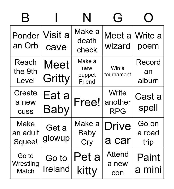 This bingo card has a free space and 24 words: Get a glowup, Go to Ireland, Make a new puppet Friend, Go to Wrestling Match, Write a poem, Ponder an Orb, Reach the 9th Level, Visit a cave, Write another RPG, Make a Baby Cry, Win a tournament, Create a new cuss, Drive a car, Go on a road trip, Meet Gritty, Attend a new con, Cast a spell, Make a death check, Record an album, Eat a Baby, Paint a mini, Make an adult Squee!, Meet a wizard and Pet a kitty.
