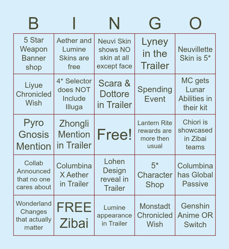 This bingo card has a free space and 24 words: Columbina X Aether in Trailer, FREE Zibai, Scara & Dottore in Trailer, Wonderland Changes that actually matter, Neuvillette Skin is 5*, 5 Star Weapon Banner shop, Liyue Chronicled Wish, Aether and Lumine Skins are free, Lantern Rite rewards are more then usual, Lohen Design reveal in Trailer, Spending Event, Pyro Gnosis Mention, 5* Character Shop, Columbina has Global Passive, 4* Selector does NOT Include Illuga, Monstadt Chronicled Wish, Chiori is showcased in Zibai teams, Neuvi Skin shows NO skin at all except face, MC gets Lunar Abilities in their kit, Zhongli Mention in Trailer, Genshin Anime OR Switch, Collab Announced that no one cares about, Lyney in the Trailer and Lumine appearance in Trailer.