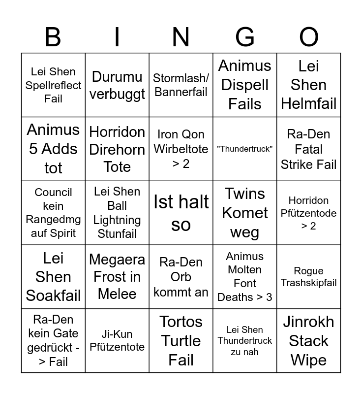 This bingo card has a free space and 48 words: Jinrokh Sprengung, Jinrokh Stack Wipe, Horridon Dmg Stop nicht eingehalten, Tortos Turtle Fail, Megaera Frost in Melee, Ji-Kun Adds laufen Rampage, Durumu verbuggt, Priomordius Große Blub zu nah, Animus 5 Adds tot, Horridon Frontal Tote, Horridon Direhorn Tote, Animus Dispell Fails, Rogue Trashskipfail, Animus Molten Font Deaths > 3, Iron Qon Zap Zap 9000, Iron Qon Speer muss im Voice gecalled werden, Iron Qon Wirbeltote > 2, Twins Komet weg, Twins Malen verkackt, Lei Shen Helmfail, Lei Shen Ball Lightning Stunfail, Lei Shen Thundertruck zu nah, Lei Shen Spellreflect Fail, "Thundertruck", Lei Shen Tanktot, Ra-Den Fatal Strike Fail, Ra-Den kein Gate gedrückt -> Fail, Ra-Den 1. Vita in Gelb, Ra-Den Orb kommt an, Lei Shen Soakfail, Lei Shen Overcharge falsche Posi, Lei Shen Gleiterfail, Ji-Kun neben Nest gesprungen, Ji-Kun Stacktote, Ji-Kun Pfützentote, Lei Shen Ball Lightning Baitfail, Lay on Hands statt BoP, Horridon Pfützentode > 2, Horridon Bait verkackt, Horridon komplett ohne DPS dispell, Meow, Dark Animus Petfail, Stormlash/ Bannerfail, Dark Animus Tankport, Council kein Rangedmg auf Spirit, Durumu Intermission Tode >= 2, Xerlos "Ach Egal" and Primordius Void callt Dispell.