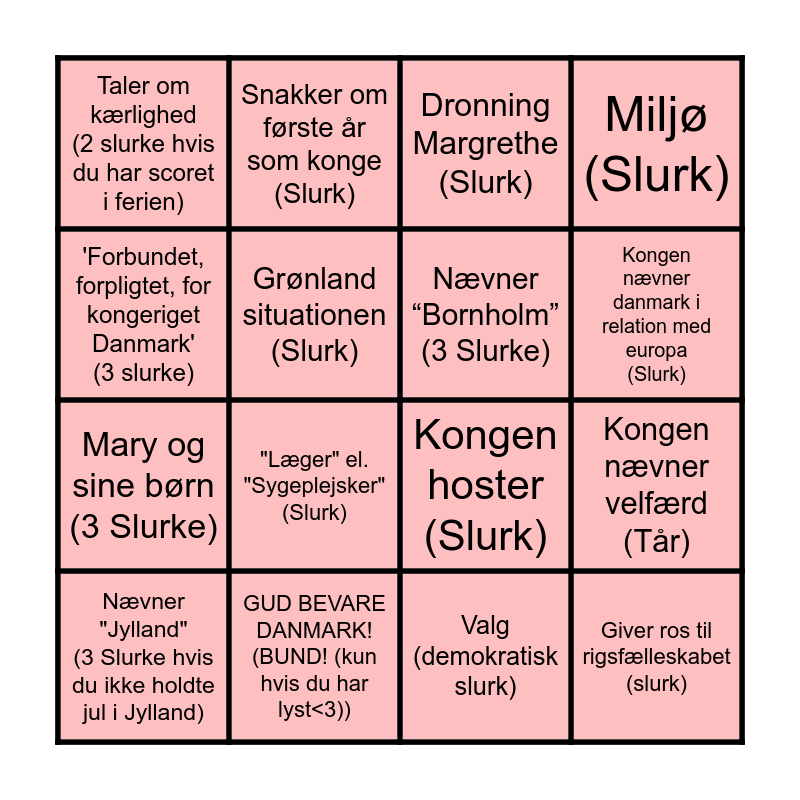 This bingo card has 28 words: Forsvaret (drik én tår for hver mili- person du kender), Tager læsebriller på (Shot), Mary og sine børn (3 Slurke), Beredskabet (Slurk), Grønland situationen (Slurk), Dronning Margrethe (Slurk), Snakker om første år som konge (Slurk), Giver ros til rigsfælleskabet (slurk), GUD BEVARE DANMARK! (BUND! (kun hvis du har lyst<3)), Mette Frederiksen (2 slurke), Kongen hoster (Slurk), Miljø (Slurk), "Danmark" (1 tår pr gang nævnt), "Ungdommen" (Slurk), "Læger" el. "Sygeplejsker" (Slurk), Kongen abdicerer (Stop øjeblikkeligt med at drikke og reflekter over livet), Digitalisering nævnt (Tår hvis din skæretid er for høj), Nævner “Bornholm” (3 Slurke), Kongen nævner danmark i relation med europa (Slurk), "Nordisk fælleskab" (Slurk), Taler om kærlighed (2 slurke hvis du har scoret i ferien), Kongen nævner Donald Trump (Slurk), Nævner "Jylland" (3 Slurke hvis du ikke holdte jul i Jylland), Kongen nævner velfærd (Tår), Valg (demokratisk slurk), Intens øjenkontakt med kameraet (Tår), 'Forbundet, forpligtet, for kongeriget Danmark' (3 slurke) and 2026 (1 slurk pr gang).