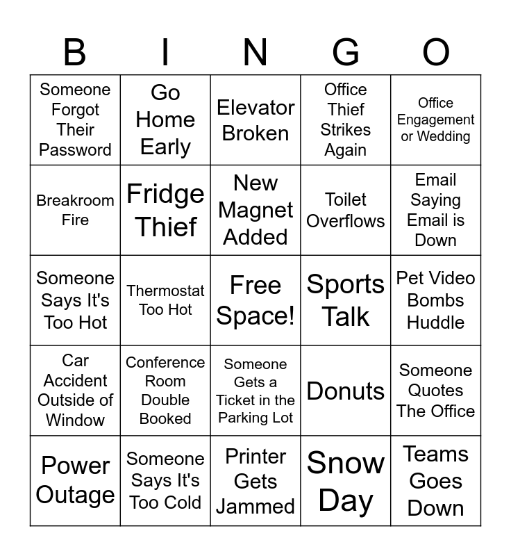 This bingo card has a free space and 31 words: Printer Gets Jammed, Unnecessary Reply-All Email, Thermostat Too Hot, Thermostat Too Cold, Someone Forgot Their Password, Elevator Broken, Fridge Thief, Donuts, Sports Talk, Snow Day, Pet Video Bombs Huddle, Teams Goes Down, Cloud Goes Down, Outlook Goes Down, Email Saying Email is Down, Late to Work d/t Accident, Someone Quotes The Office, Conference Room Double Booked, Car Accident Outside of Window, Someone Gets a Ticket in the Parking Lot, Office Engagement or Wedding, Conference Speaker Cancels Last Minute, Power Outage, Go Home Early, Toilet Overflows, Breakroom Fire, Office Thief Strikes Again, Someone Says It's Too Hot, Someone Says It's Too Cold, New Magnet Added and Kid Video Bombs a Huddle.