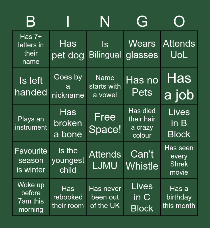 This bingo card has a free space and 27 words: Can't Whistle, Has 3+ siblings, Has no Pets, Has never been out of the UK, Is left handed, Is Bilingual, Has pet dog, Favourite season is winter, Has died their hair a crazy colour, Has seen every Shrek movie, Plays an instrument, Wears glasses, Woke up before 7am this morning, Has rebooked their room, Has a job, Has been scuba diving, Goes by a nickname, Name starts with a vowel, Is the youngest child, Has 7+ letters in their name, Lives in B Block, Lives in C Block, Has broken a bone, Has a birthday this month, Attends LJMU, Attends UoL and Attends LIPA.