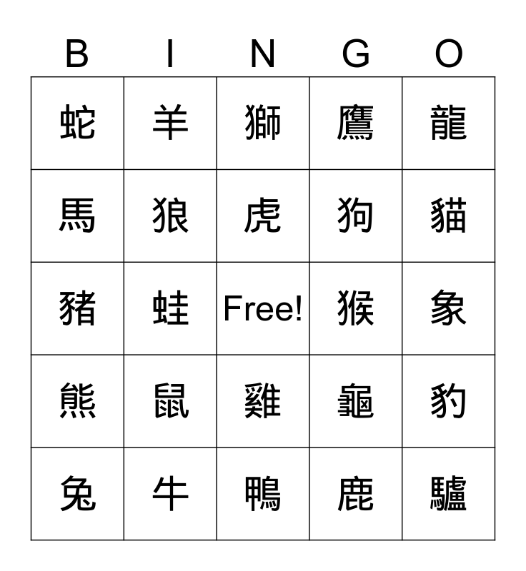 This bingo card has a free space and 24 words: 鼠, 牛, 虎, 兔, 龍, 蛇, 馬, 羊, 猴, 雞, 狗, 豬, 龜, 豹, 狼, 鹿, 象, 獅, 貓, 蛙, 驢, 熊, 鷹 and 鴨.