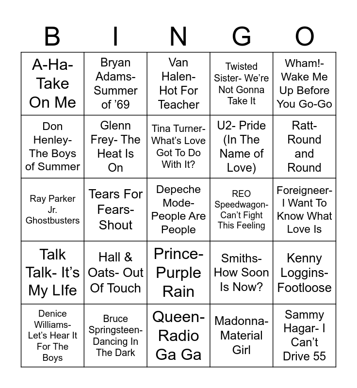 This bingo card has 26 words: Prince- Purple Rain, Madonna- Material Girl, Tina Turner- What’s Love Got To Do With It?, Bruce Springsteen- Dancing In The Dark, Wham!- Wake Me Up Before You Go-Go, A-Ha- Take On Me, Don Henley- The Boys of Summer, Bryan Adams- Summer of ’69, Foreigneer- I Want To Know What Love Is, Smiths- How Soon Is Now?, U2- Pride (In The Name of Love), Ray Parker Jr. Ghostbusters, Kenny Loggins- Footloose, Denice Williams- Let’s Hear It For The Boys, Tears For Fears- Shout, Stevie Wonder- I Just Called To Say I Love You, Twisted Sister- We’re Not Gonna Take It, Talk Talk- It’s My LIfe, Van Halen- Hot For Teacher, Depeche Mode- People Are People, Ratt- Round and Round, Queen- Radio Ga Ga, REO Speedwagon- Can’t Fight This Feeling, Hall & Oats- Out Of Touch, Glenn Frey- The Heat Is On and Sammy Hagar- I Can’t Drive 55.