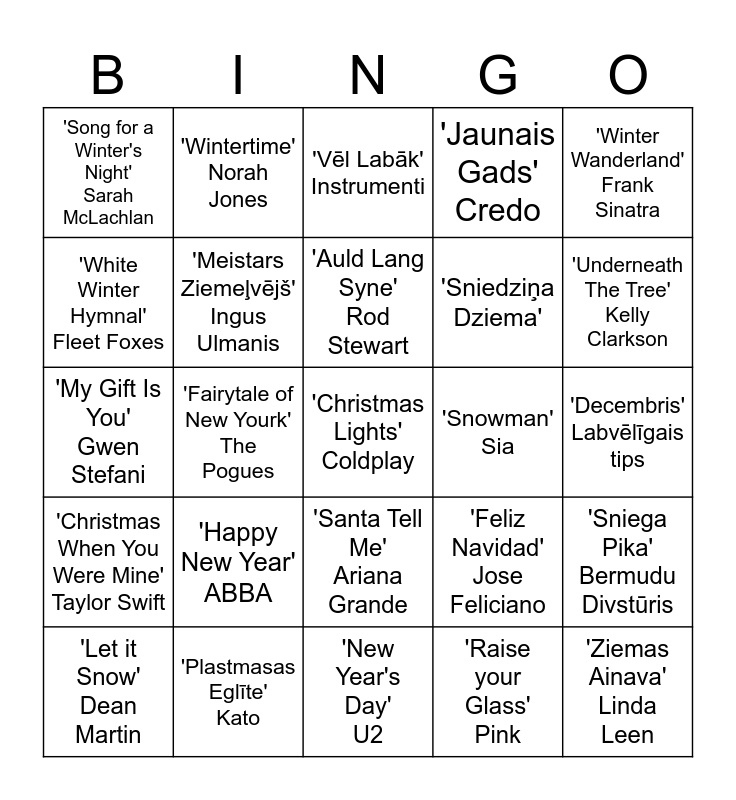 This bingo card has 25 words: 'Happy New Year' ABBA, 'New Year's Day' U2, 'Auld Lang Syne' Rod Stewart, 'Let it Snow' Dean Martin, 'Winter Wanderland' Frank Sinatra, 'Song for a Winter's Night' Sarah McLachlan, 'White Winter Hymnal' Fleet Foxes, 'Wintertime' Norah Jones, 'Snowman' Sia, 'Santa Tell Me' Ariana Grande, 'Sniedziņa Dziema', 'My Gift Is You' Gwen Stefani, 'Feliz Navidad' Jose Feliciano, 'Sniega Pika' Bermudu Divstūris, 'Meistars Ziemeļvējš' Ingus Ulmanis, 'Ziemas Ainava' Linda Leen, 'Decembris' Labvēlīgais tips, 'Vēl Labāk' Instrumenti, 'Underneath The Tree' Kelly Clarkson, 'Fairytale of New Yourk' The Pogues, 'Christmas Lights' Coldplay, 'Plastmasas Eglīte' Kato, 'Christmas When You Were Mine' Taylor Swift, 'Jaunais Gads' Credo and 'Raise your Glass' Pink.