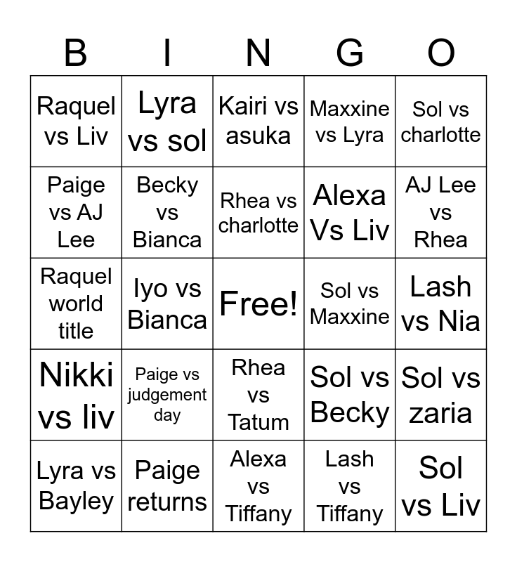 This bingo card has a free space and 24 words: Paige vs judgement day, Paige returns, Rhea vs charlotte, Lyra vs Bayley, Sol vs charlotte, Raquel vs Liv, Paige vs AJ Lee, Lyra vs sol, Sol vs Maxxine, Rhea vs Tatum, Alexa Vs Liv, Raquel world title, Sol vs Becky, Sol vs zaria, Becky vs Bianca, Lash vs Tiffany, Lash vs Nia, Kairi vs asuka, AJ Lee vs Rhea, Iyo vs Bianca, Sol vs Liv, Nikki vs liv, Maxxine vs Lyra and Alexa vs Tiffany.