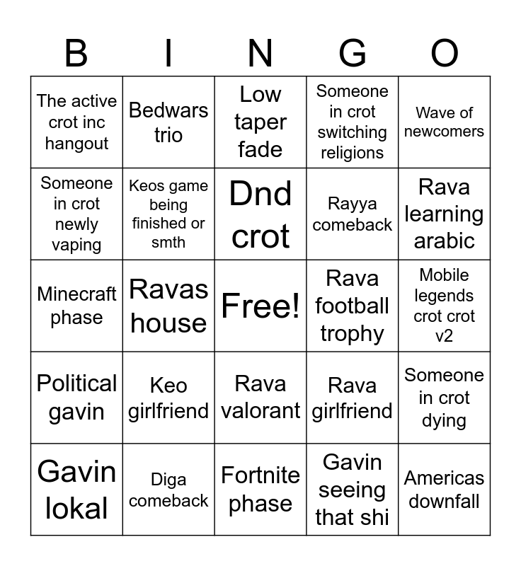 This bingo card has a free space and 24 words: Gavin lokal, Keo girlfriend, Dnd crot, Gavin seeing that shi, Wave of newcomers, The active crot inc hangout, Bedwars trio, Low taper fade, Rava football trophy, Mobile legends crot crot v2, Minecraft phase, Keos game being finished or smth, Rava girlfriend, Someone in crot dying, Someone in crot newly vaping, Diga comeback, Fortnite phase, Someone in crot switching religions, Rava learning arabic, Political gavin, Ravas house, Rava valorant, Rayya comeback and Americas downfall.
