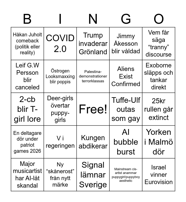 This bingo card has a free space and 24 words: V i regeringen, Ny “skånerost” från nytt märke, Palestina-demonstrationer terrorklassas, Major musicartist har AI-låt skandal, Vem får säga “tranny” discourse, Håkan Juholt comeback (politik eller reality), Leif G.W Persson blir canceled, COVID 2.0, Tuffe-Ulf outas som gay, Kungen abdikerar, Aliens Exist Confirmed, 2-cb blir T-girl lore, AI bubble burst, Yorken i Malmö dör, Östrogen Looksmaxxing blir poppis, Mainstream cis-artist anammar puppygirl/puppyboy aesthetic, 25kr rullen går extinct, Trump invaderar Grönland, Exoborne släpps och tankar direkt, Deer-girls övertar puppy-girls, Israel vinner Eurovision, En deltagare dör under patriot games 2026, Jimmy Åkesson blir våldad and Signal lämnar Sverige.