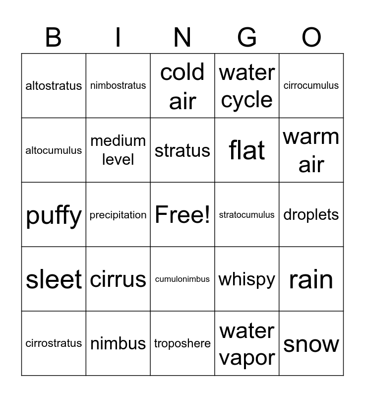 This bingo card has a free space and 24 words: cirrus, nimbus, stratus, cirrostratus, cirrocumulus, altostratus, altocumulus, nimbostratus, stratocumulus, cumulonimbus, flat, puffy, whispy, rain, medium level, water vapor, droplets, cold air, warm air, precipitation, snow, sleet, water cycle and troposhere.
