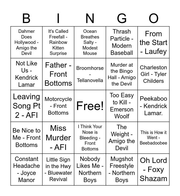 This bingo card has a free space and 41 words: Your Graduation - Modern Baseball, Leaving Song Pt 2 - AFI, Bitin List - Tyler Childers, Father - Front Bottoms, Little Sign in the Hwy - Bluewater Revival, I Think Your Nose is Bleeding - Front Bottoms, Broomhorse - Tellanovella, Sleeping on the Blacktop - Colter Wall, From the Start - Laufey, Be Nice to Me - Front Bottoms, Motorcycle - Front Bottoms, Thrash Particle - Modern Baseball, Oh Lord - Foxy Shazam, Peekaboo - Kendrick Lamar., Too Easy to Kill - Emerson Woolf, Miss Murder - AFI, Step on Me - The Cardigans, Dahmer Does Hollywood - Amigo the Devil, Deadmans Curve - Tyler Childers, Ocean Breathes Salty - Modest Mouse, This is How it Went - Beebadoobee, Taste of Ink - The Used, Nobody Likes Me - Northern Boys, Murder at the Bingo Hall - Amigo the Devil, First Class - Rainbow Kitten Surprise, No Children - The Mountain Goats, Mugshot Freestyle - Northern Boys, Cocaine Jesus - Rainbow Kitten Surprise, Charleston Girl - Tyler Childers, The Mummy - Benji Hughes, Hungover in Jonestown - Amigo the Devil, It's Called Freefall - Rainbow Kitten Surprise, Constant Headache - Joyce Manor, You Can Have the Crown - Sturgil Simpson, The Weight - Amigo the Devil, Not Like Us - Kendrick Lamar, Re-Do - Modern Baseball, Silver and Cold - AFI, Squabble Up - Kendrick Lamar, One Week - Barenaked Ladies and Gates of Steel - Devo.