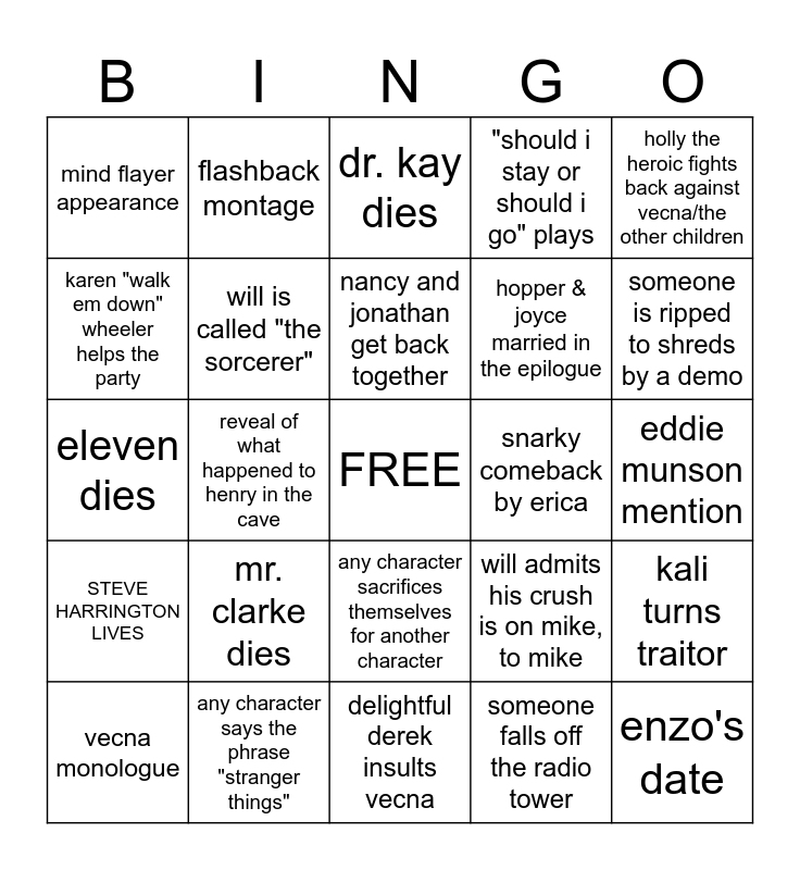 This bingo card has a free space and 24 words: mr. clarke dies, any character says the phrase "stranger things", nancy and jonathan get back together, vecna monologue, holly the heroic fights back against vecna/the other children, mind flayer appearance, karen "walk em down" wheeler helps the party, flashback montage, snarky comeback by erica, any character sacrifices themselves for another character, hopper & joyce married in the epilogue, eleven dies, will admits his crush is on mike, to mike, kali turns traitor, will is called "the sorcerer", someone falls off the radio tower, eddie munson mention, dr. kay dies, someone is ripped to shreds by a demo, reveal of what happened to henry in the cave, enzo's date, STEVE HARRINGTON LIVES, "should i stay or should i go" plays and delightful derek insults vecna.