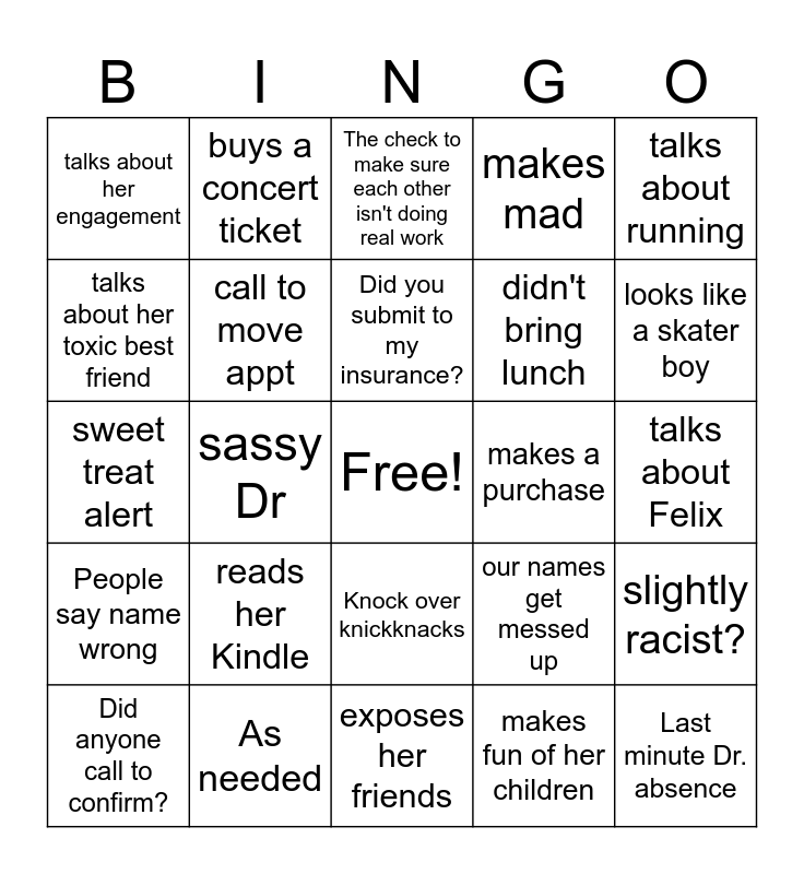 This bingo card has a free space and 24 words: reads her Kindle, As needed, Did you submit to my insurance?, Did anyone call to confirm?, talks about running, talks about her engagement, talks about her toxic best friend, buys a concert ticket, makes a purchase, Knock over knickknacks, didn't bring lunch, sweet treat alert, our names get messed up, slightly racist?, call to move appt, makes fun of her children, talks about Felix, The check to make sure each other isn't doing real work, looks like a skater boy, sassy Dr, Last minute Dr. absence, People say name wrong, makes mad and exposes her friends.