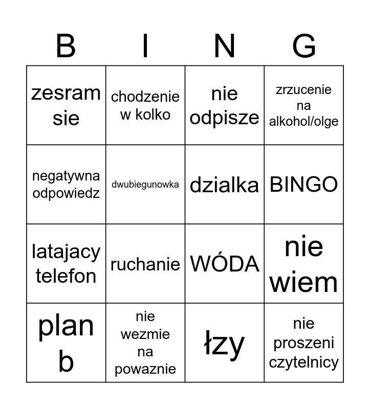 This bingo card has 16 words: nie wezmie na powaznie, nie wiem, nie odpisze, zesram sie, latajacy telefon, chodzenie w kolko, WÓDA, łzy, negatywna odpowiedz, dwubiegunowka, plan b, zrzucenie na alkohol/olge, ruchanie, BINGO, dzialka and nie proszeni czytelnicy.