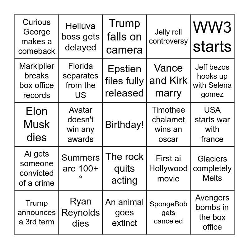 This bingo card has a free space and 24 words: Summers are 100+°, Ryan Reynolds dies, Epstien files fully released, Trump announces a 3rd term, WW3 starts, Curious George makes a comeback, Markiplier breaks box office records, Helluva boss gets delayed, Timothee chalamet wins an oscar, The rock quits acting, Vance and Kirk marry, Elon Musk dies, First ai Hollywood movie, Glaciers completely Melts, Florida separates from the US, SpongeBob gets canceled, USA starts war with france, Trump falls on camera, Jeff bezos hooks up with Selena gomez, Avatar doesn't win any awards, Avengers bombs in the box office, Ai gets someone convicted of a crime, Jelly roll controversy and An animal goes extinct.
