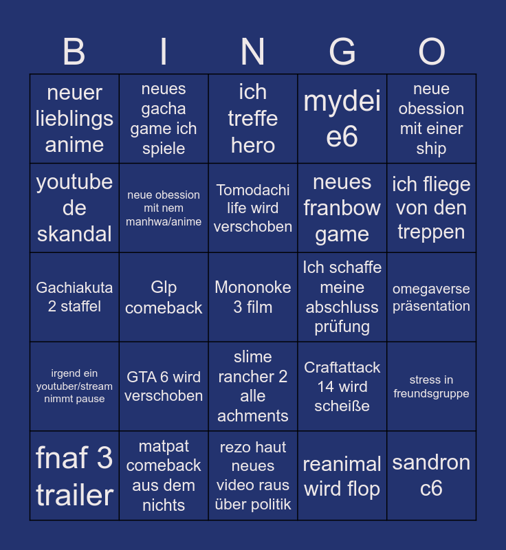 This bingo card has a free space and 24 words: GTA 6 wird verschoben, matpat comeback aus dem nichts, Tomodachi life wird verschoben, fnaf 3 trailer, neue obession mit einer ship, neuer lieblings anime, youtube de skandal, neues gacha game ich spiele, Ich schaffe meine abschluss prüfung, slime rancher 2 alle achments, neues franbow game, Gachiakuta 2 staffel, Craftattack 14 wird scheiße, stress in freundsgruppe, neue obession mit nem manhwa/anime, reanimal wird flop, omegaverse präsentation, ich treffe hero, ich fliege von den treppen, Glp comeback, sandron c6, irgend ein youtuber/stream nimmt pause, mydei e6 and rezo haut neues video raus über politik.