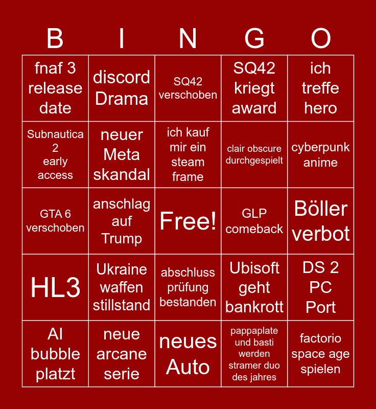 This bingo card has a free space and 24 words: Ukraine waffen stillstand, neue arcane serie, ich kauf mir ein steam frame, AI bubble platzt, ich treffe hero, fnaf 3 release date, Subnautica 2 early access, discord Drama, GLP comeback, abschluss prüfung bestanden, clair obscure durchgespielt, GTA 6 verschoben, Ubisoft geht bankrott, DS 2 PC Port, neuer Meta skandal, pappaplate und basti werden stramer duo des jahres, Böller verbot, SQ42 verschoben, cyberpunk anime, anschlag auf Trump, factorio space age spielen, HL3, SQ42 kriegt award and neues Auto.