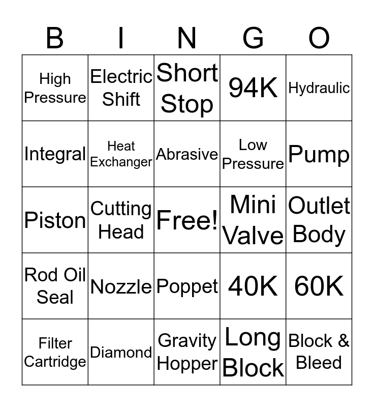 This bingo card has a free space and 50 words: Mini Hopper, Block & Bleed, Coning Tool, Gravity Hopper, Nozzle, Ceramic Plunger, Electric Shift, Short Block, Integral, Tie Rod, Heat Exchanger, 94K, 60K, 40K, Blue Goop, Bulk Hopper, Abrasive, Mini Valve, Splash Guard, Hydraulic, Cutting Head, Long Block, High Pressure, Low Pressure, Advantage, Mini Valve, Pump, Ultra II, Short Stop, Poppet, On/Off Valve, End Cap, Repair Kit, Ruby, Diamond, Sapphire, HP Cylinder, High Performance, The Edge, Outlet Body, Intensifier, IDNN, IDE, Tubing, Filter Cartridge, Piston, Check Valve, SMP, Rod Oil Seal and Air Actuator.