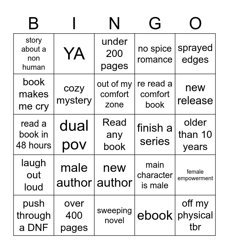 This bingo card has a free space and 24 words: male author, over 400 pages, out of my comfort zone, push through a DNF, sprayed edges, story about a non human, book makes me cry, YA, finish a series, new author, re read a comfort book, read a book in 48 hours, main character is male, female empowerment, cozy mystery, ebook, older than 10 years, under 200 pages, new release, dual pov, off my physical tbr, laugh out loud, no spice romance and sweeping novel.