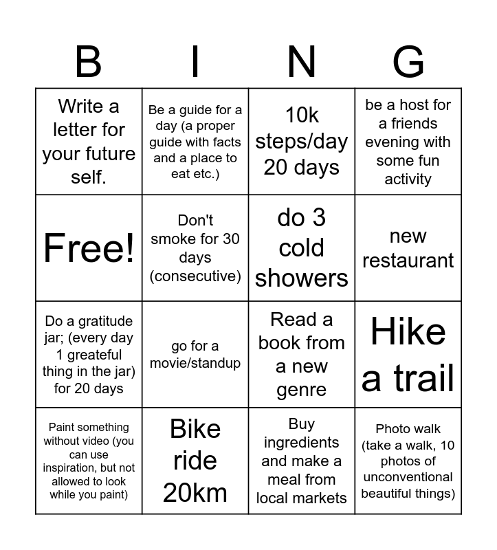 This bingo card has 16 words: Bike ride 20km, Hike a trail, 10k steps/day 20 days, Write a letter for your future self., Do a gratitude jar; (every day 1 greateful thing in the jar) for 20 days, Be a guide for a day (a proper guide with facts and a place to eat etc.), Read a book from a new genre, Buy ingredients and make a meal from local markets, Free!, Don't smoke for 30 days (consecutive), Paint something without video (you can use inspiration, but not allowed to look while you paint), be a host for a friends evening with some fun activity, go for a movie/standup, new restaurant, do 3 cold showers and Photo walk (take a walk, 10 photos of unconventional beautiful things).
