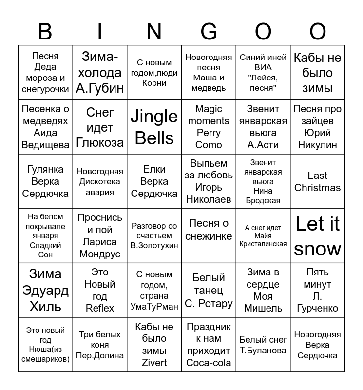 This bingo card has 36 words: Белый танец С. Ротару, С новым годом, страна УмаТуРман, Праздник к нам приходит Coca-cola, Песенка о медведях Аида Ведищева, На белом покрывале января Сладкий Сон, Выпьем за любовь Игорь Николаев, Снег идет Глюкоза, Кабы не было зимы Zivert, Синий иней ВИА "Лейся, песня", Зима в сердце Моя Мишель, Песня про зайцев Юрий Никулин, Новогодняя песня Маша и медведь, Пять минут Л. Гурченко, Новогодняя Дискотека авария, Magic moments Perry Como, Песня Деда мороза и снегурочки, Зима Эдуард Хиль, Звенит январская вьюга Нина Бродская, Гулянка Верка Сердючка, С новым годом,люди Корни, Елки Верка Сердючка, Проснись и пой Лариса Мондрус, Песня о снежинке, Разговор со счастьем В.Золотухин, А снег идет Майя Кристалинская, Зима-холода А.Губин, Звенит январская вьюга А.Асти, Три белых коня Пер.Долина, Jingle Bells, Кабы не было зимы, Новогодняя Верка Сердючка, Это новый год Нюша(из смешариков), Let it snow, Last Christmas, Это Новый год Reflex and Белый снег Т.Буланова.