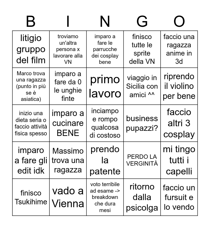 This bingo card has 25 words: Massimo trova una ragazza, voto terribile ad esame -> breakdown che dura mesi, primo lavoro, finisco Tsukihime, faccio una ragazza anime in 3d, litigio gruppo del film, Marco trova una ragazza (punto in più se è asiatica), troviamo un'altra persona x lavorare alla VN, business pupazzi?, prendo la patente, viaggio in Sicilia con amici ^^, inizio una dieta seria o faccio attività fisica spesso, PERDO LA VERGINITÀ, mi tingo tutti i capelli, imparo a fare da 0 le unghie finte, faccio un fursuit e lo vendo, faccio altri 3 cosplay, imparo a fare le parrucche dei cosplay bene, riprendo il violino per bene, imparo a cucinare BENE, inciampo e rompo qualcosa di costoso, vado a Vienna, imparo a fare gli edit idk, finisco tutte le sprite della VN and ritorno dalla psicolga.