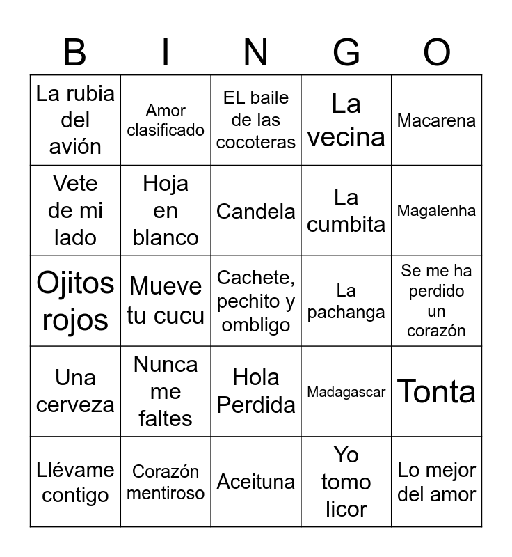 This bingo card has 56 words: La Chica de rojo, Llévame contigo, Que quiere la Chola, La rubia del avión, Aceituna, El embrujo, Hoja en blanco, Bonita y mentirosa, La cumbita, El campanero, La vecina, Nunca me faltes, Amigo mío, La ventanita, Mentirosa, Tonta, Macarena, Mueve tu cucu, El colesterol, Cachete, pechito y ombligo, La pachanga, Locomía, Madagascar, EL baile de las cocoteras, Violeta, Candela, Desesperada, El baile de la botella, Magalenha, onda onda, Dana do vampiro, Ilarie, Por eso vivo, Fuiste, Se me ha perdido un corazón, Vete de mi lado, Ojitos rojos, Díganle, Una cerveza, Amor clasificado, Hola Perdida, Lo mejor del amor, Que me falte todo, No te creas tan importante, Con la misma moneda, Nunca me faltes, Corazón mentiroso, El soy yo, Pídeme la luna, El mundo, Yo tomo licor, Cinco minutos, Que calor, Que bonito, Tonta and Conmigo te gusto.