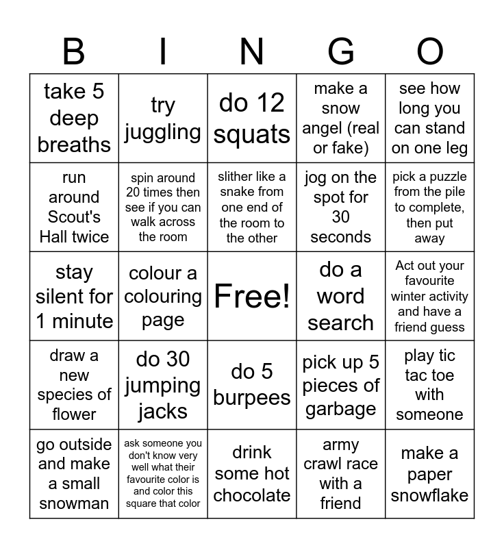 This bingo card has a free space and 24 words: do 30 jumping jacks, ask someone you don't know very well what their favourite color is and color this square that color, slither like a snake from one end of the room to the other, go outside and make a small snowman, see how long you can stand on one leg, take 5 deep breaths, run around Scout's Hall twice, try juggling, do a word search, do 5 burpees, jog on the spot for 30 seconds, stay silent for 1 minute, pick up 5 pieces of garbage, play tic tac toe with someone, spin around 20 times then see if you can walk across the room, army crawl race with a friend, Act out your favourite winter activity and have a friend guess, do 12 squats, pick a puzzle from the pile to complete, then put away, colour a colouring page, make a paper snowflake, draw a new species of flower, make a snow angel (real or fake) and drink some hot chocolate.