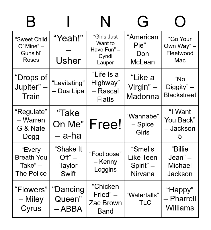 This bingo card has a free space and 70 words: “Respect” – Aretha Franklin, “I Want You Back” – Jackson 5, “Sweet Caroline” – Neil Diamond, “September” – Earth, Wind & Fire, “Dancing Queen” – ABBA, “Stayin’ Alive” – Bee Gees, “American Pie” – Don McLean, “My Girl” – The Temptations, “Go Your Own Way” – Fleetwood Mac, “Ain’t No Mountain High Enough” – Marvin Gaye & Tammi Terrell, “Billie Jean” – Michael Jackson, “Don’t Stop Believin’” – Journey, “Sweet Child O’ Mine” – Guns N’ Roses, “Girls Just Want to Have Fun” – Cyndi Lauper, “Livin’ on a Prayer” – Bon Jovi, “Take On Me” – a-ha, “Footloose” – Kenny Loggins, “Like a Virgin” – Madonna, “Wake Me Up Before You Go-Go” – Wham!, “Every Breath You Take” – The Police, “Wannabe” – Spice Girls, “Smells Like Teen Spirit” – Nirvana, “No Diggity” – Blackstreet, “I Want It That Way” – Backstreet Boys, “Baby Got Back” – Sir Mix-A-Lot, “Torn” – Natalie Imbruglia, “U Can’t Touch This” – MC Hammer, “Semi-Charmed Life” – Third Eye Blind, “Waterfalls” – TLC, “Wonderwall” – Oasis, “Yeah!” – Usher, “Crazy in Love” – Beyoncé, “Mr. Brightside” – The Killers, “Hey Ya!” – OutKast, “Since U Been Gone” – Kelly Clarkson, “In Da Club” – 50 Cent, “Complicated” – Avril Lavigne, “Hot in Herre” – Nelly, “Hollaback Girl” – Gwen Stefani, “Drops of Jupiter” – Train, “Uptown Funk” – Mark Ronson ft. Bruno Mars, “Shake It Off” – Taylor Swift, “Happy” – Pharrell Williams, “Blinding Lights” – The Weeknd, “Old Town Road” – Lil Nas X, “Levitating” – Dua Lipa, “Flowers” – Miley Cyrus, “Anti-Hero” – Taylor Swift, “As It Was” – Harry Styles, “Cruel Summer” – Taylor Swift, “Friends in Low Places” – Garth Brooks, “Man! I Feel Like a Woman!” – Shania Twain, “Before He Cheats” – Carrie Underwood, “Wagon Wheel” – Darius Rucker, “Chicken Fried” – Zac Brown Band, “Tennessee Whiskey” – Chris Stapleton, “Life Is a Highway” – Rascal Flatts, “Lose Yourself” – Eminem, “This Is How We Do It” – Montell Jordan, “Poison” – Bell Biv DeVoe, “Regulate” – Warren G & Nate Dogg, “Gold Digger” – Kanye West, “Yeah!” – Usher, “It Takes Two” – Rob Base & DJ EZ Rock, “YMCA” – Village People, “Macarena” – Los Del Rio, “Cupid Shuffle” – Cupid, “Let It Go” – Idina Menzel, “The Final Countdown” – Europe and “We Will Rock You” – Queen.