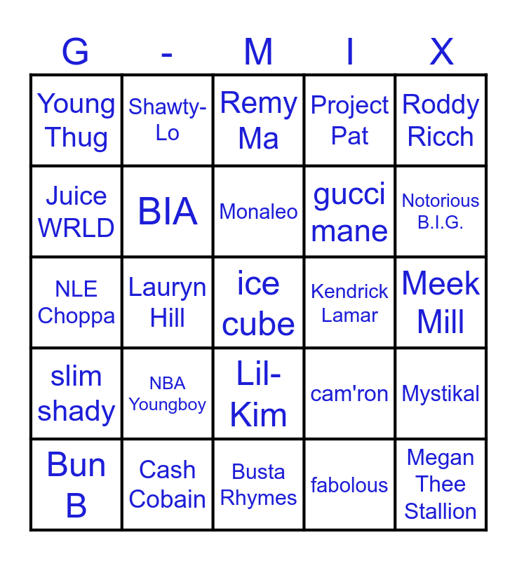 This bingo card has 159 words: Lil Tecca, LL Cool J, Young Jeezy, Lil Wayne, Soulja Boy, Ice-T, Coi Leray, Ice Spice, Finesse 2tymes, Tee Grizzley, Kendrick Lamar, SNOOP DOGG, gucci mane, Timbaland, Lil-Kim, Kurtis Blow, Dmx, Hurricane Chris, Slick Rick, Glorilla, Lil Baby, Da Baby, Drake, Kodak Black, King Von, Sage the Gemini, Mystikal, cam'ron, Salt-N-Pepa, Unk, Queen Latifah, Uncle Luke, 2 Chainz, Hanumankind, Young M.A., J. Cole, Offset, GloRilla, Jack Harlow, Jim Jones, MC Lyte, Waka flocka, megan thee stallion, missy elliott, Nas, 50 Cent, A$AP Rocky, Lupe Fiasco, Big Sean, Travis Scott, Tyga, Busta Rhymes, Playboi Carti, Juice WRLD, Juicy J, Bun B, fetty wap, French Montana, Bobby Shmurda, Dr. Dre, Roddy Ricch, ice cube, fabolous, nate dogg, Future, Lauryn Hill, Post Malone, Lola Brooke, JT, BIA, Erica Banks, Rubi Rose, Monaleo, Young m.a., scarlip, Lil Scrappy, slim shady, PLUTO, Gucci Mane, jay-z, Young Dolph, Yeat, OhGeesy, BashfortheWorld, Rockout Danny, BAK Jay, Ludacris, BossMan Dlow, Flo Milli, Doechii, BigXthaPlug, ScHoolboy Q, Lana Del Rey, Central Cee, NLE Choppa, Boosie, Big Boogie, Kevin Gates, Moneybagg yo, NBA Youngboy, tuPac, Notorious B.I.G., Meek Mill, Nicki Minaj, sexyy red, Latto, Connie Diiamond, KASH DOLL, Remy Ma, Cardi B, Asian Doll, Cash Cobain, Don Toliver, Rick Ross, Real Boston Richey, Brother D, Juvenile, Lil Jon, Trick Daddy, Flo Rida, Trina, Megan Thee Stallion, Scarface, Young Thug, Ace Hood, Yo Gotti, babychiefdolt, Gelo, odeal, kai ca$h, Plies, YFN Lucci, Rich Homie Quan, T-Pain, Travis Porter, 21 Savage, Shawty-Lo, Lil-Kim, TI, Master P, kanye west, dj mustard, Above the Law, Project Pat, yella Beezy, styles P, Fivo Foreign, DJ Khaled, Pop Smoke, 50 cent, Chief Keef, Tyler the Creator, Young M.A, bunnab, YKNiece, eve, Doja Cat, Rapsody and mia x.