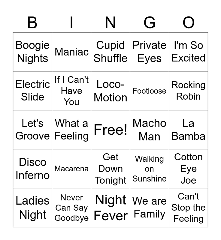This bingo card has a free space and 42 words: YMCA, Loco-Motion, Staying Alive, Macarena, We are Family, Cotton Eye Joe, Can't Stop the Feeling, Cha Cha Slide, Cupid Shuffle, Get Down Tonight, La Bamba, Rocking Robin, What a Feeling, I'm So Excited, Gloria, Walking on Sunshine, Celebration, Let's Groove, Everlasting Love, Maniac, Electric Slide, Cupid Flex, I Want to Dance with Somebody, Boogie Nights, Boots On the Ground, Mama Mia, Footloose, Dancing in the Street, Walk this Way, Whip It, Hot Stuff, Disco Inferno, If I Can't Have You, Night Fever, Get Down Tonight, Ladies Night, Never Can Say Goodbye, Macho Man, Shout, More More More, Private Eyes and Mickey.