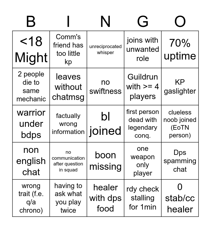 This bingo card has a free space and 24 words: no communication after question in squad, having to ask what you play twice, no swiftness, wrong trait (f.e. q/a chrono), 70% uptime, <18 Might, 2 people die to same mechanic, Comm's friend has too little kp, first person dead with legendary conq., boon missing, Guildrun with >= 4 players, warrior under bdps, one weapon only player, Dps spamming chat, leaves without chatmsg, rdy check stalling for 1min, clueless noob joined (EoTN person), unreciprocated whisper, KP gaslighter, factually wrong information, 0 stab/cc healer, non english chat, joins with unwanted role and healer with dps food.